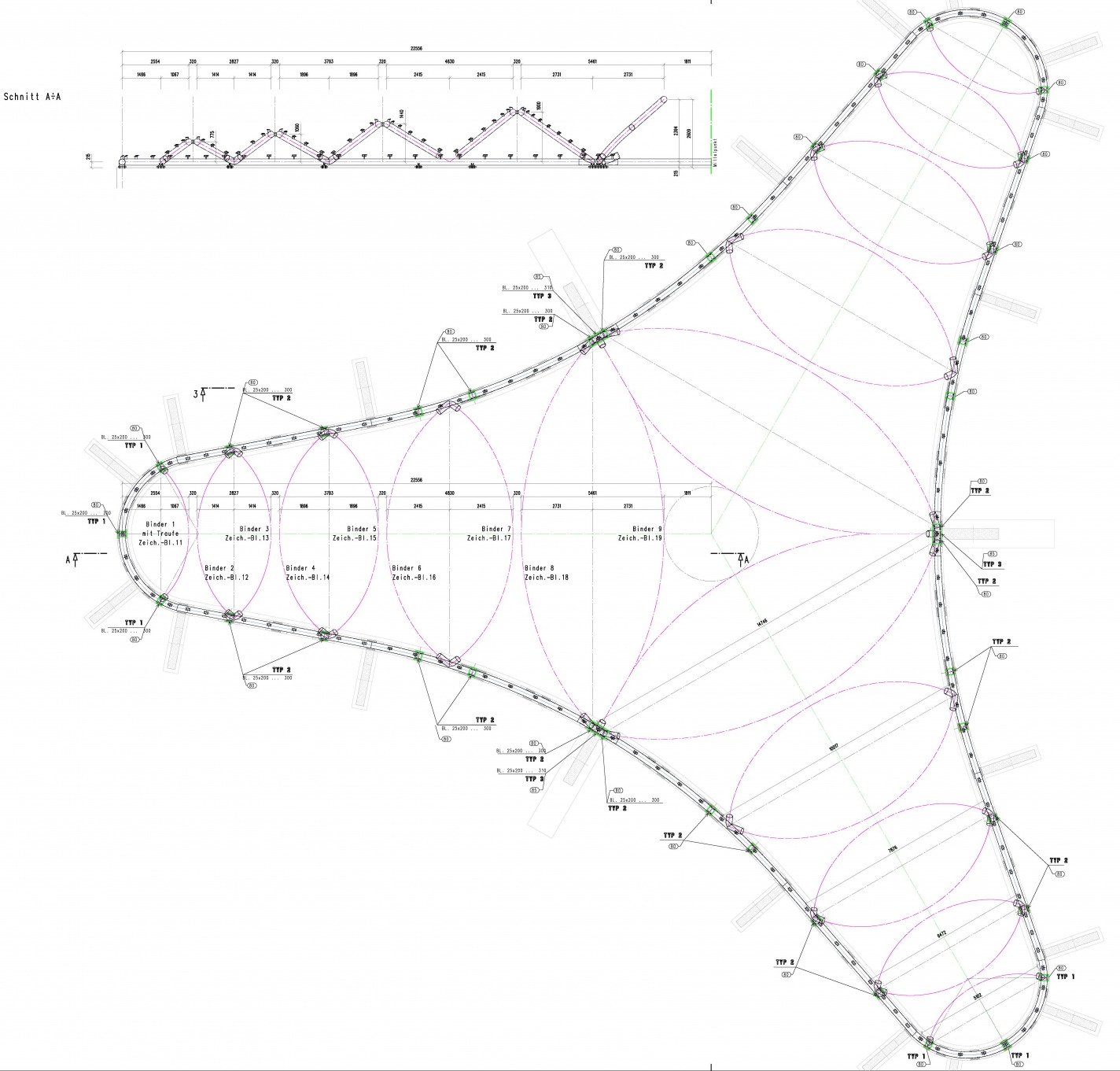 Stahl Bogenbinder in den Firstpunkten gekoppelt