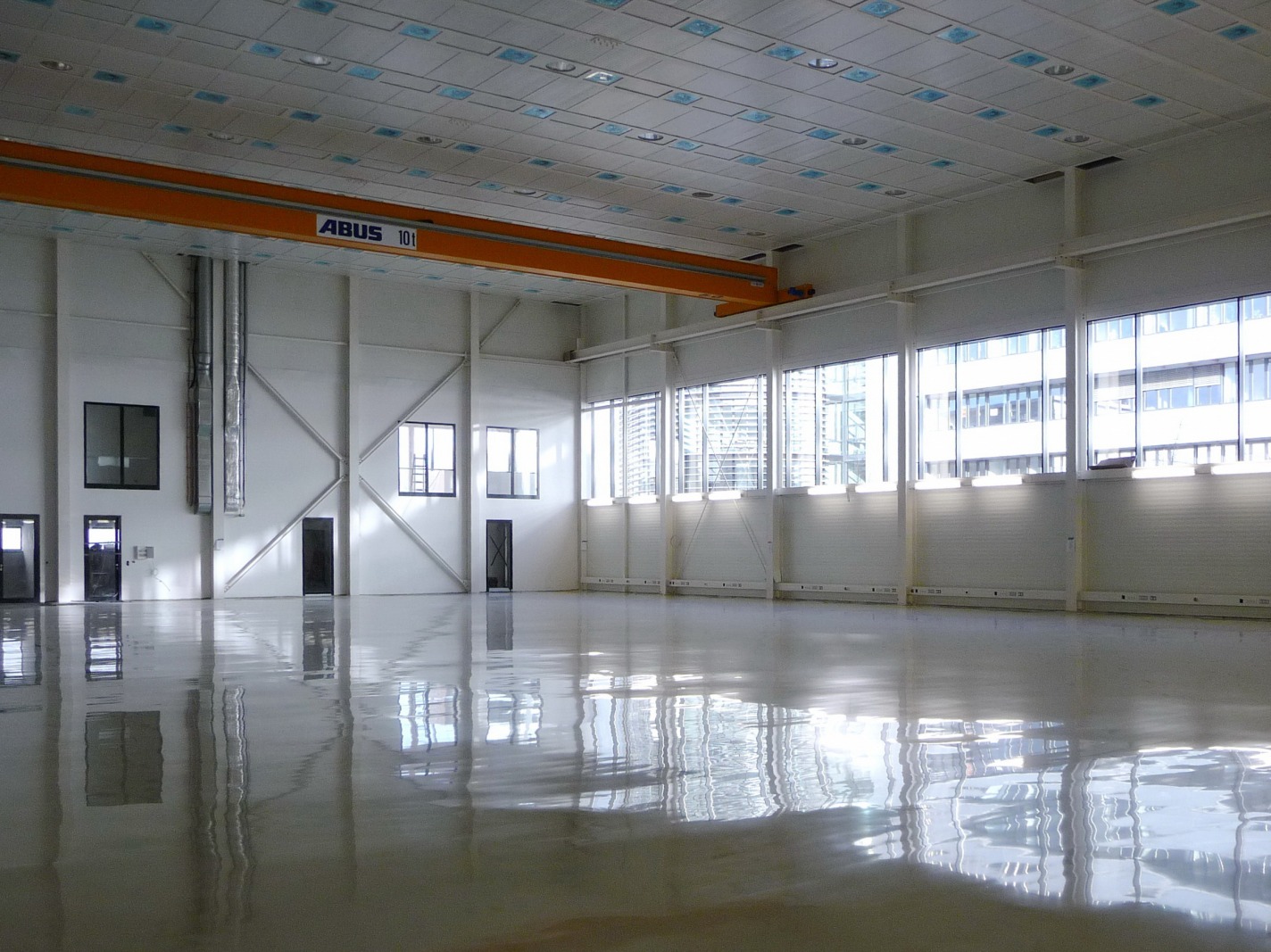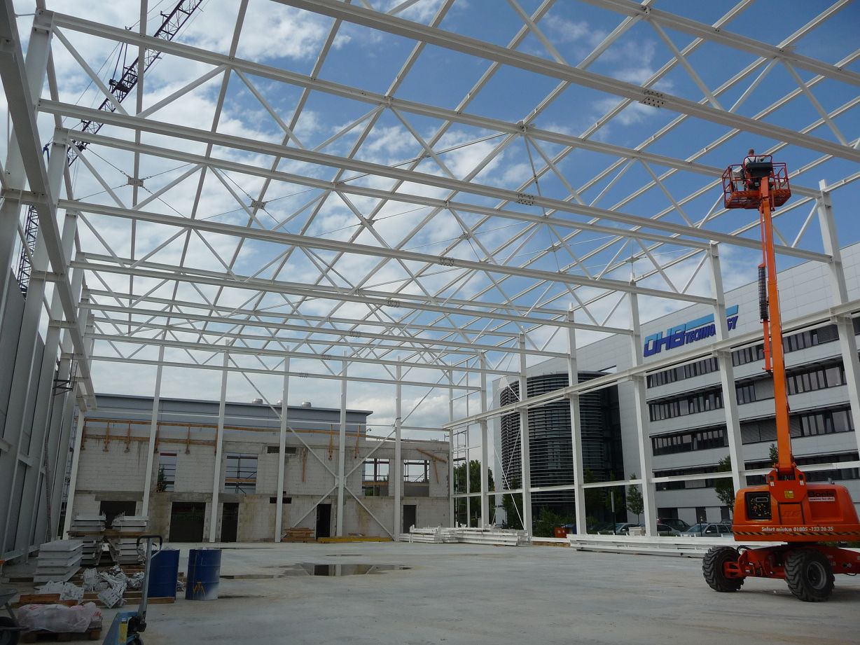 Reinlufthalle: Stahlkonstruktion mit Fachwerk-Dachbindern, 10t-Kran
