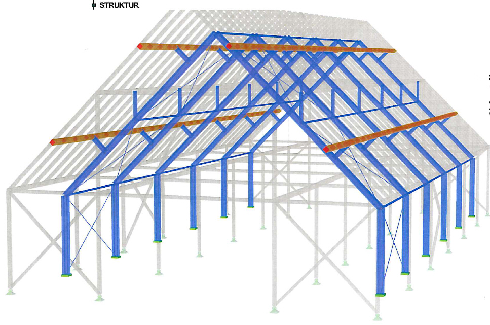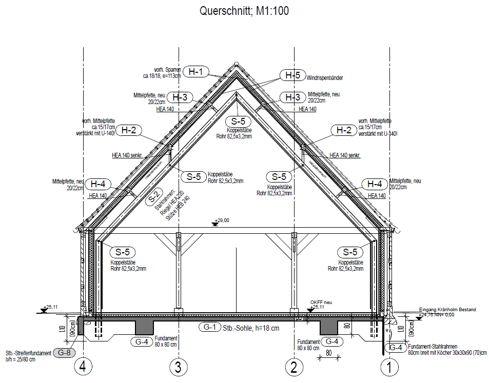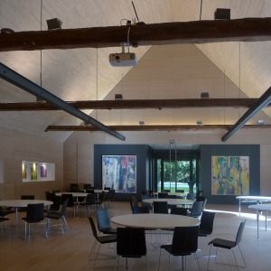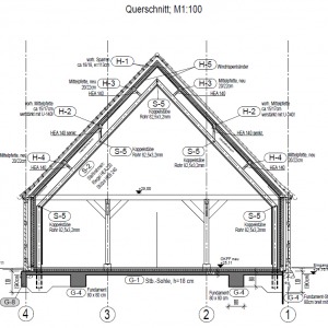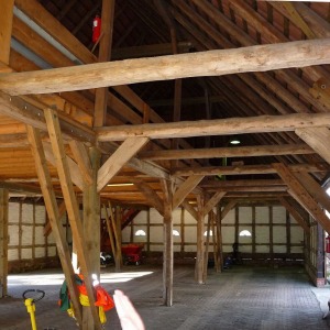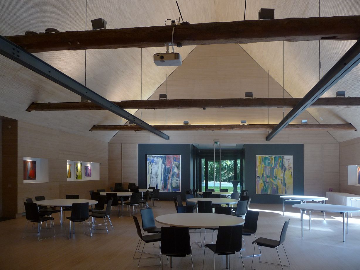 Die alte Scheune erhielt im Inneren eine neue Gründung und ein stützendes Stahltragwerk, um das Holztragwerk teilweise ausbauen zu können und so einen geräumigen Veranstaltungssaal zu erhalten.